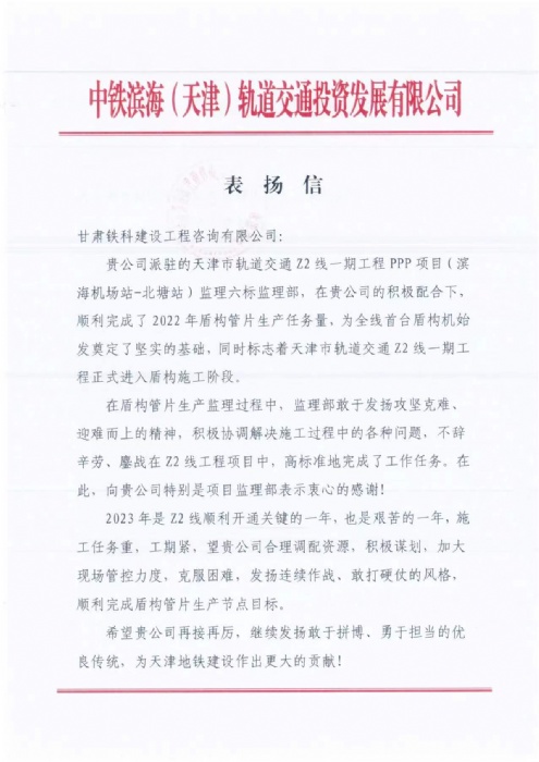 1月7日,中鐵濱海(天津)軌道交通投資發(fā)展有限公司向甘肅鐵科發(fā)來表揚信,對甘肅鐵科天津市軌道交通Z2線一期工程監(jiān)理部順利完成2022年盾構(gòu)管片生產(chǎn)任務(wù)量,推動天...