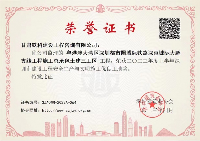 近日,深圳建筑業(yè)協(xié)會發(fā)布表彰決定,由中鐵科研院甘肅鐵科監(jiān)理的深惠城際大鵬支線工程施工總承包土建三、四兩個工區(qū)被評為“2023年度上半年深圳市建設(shè)工程安全生產(chǎn)與文明施工優(yōu)良工地獎”。